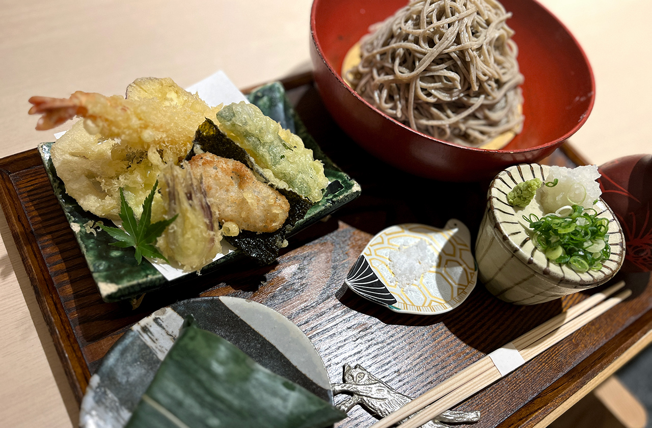 香り高く、ツヤのあるそばに、自家調合の出汁や揚げたてサクサクの天ぷら、笹巻きおこわが付く「そばランチ」は、値段以上の満足感。