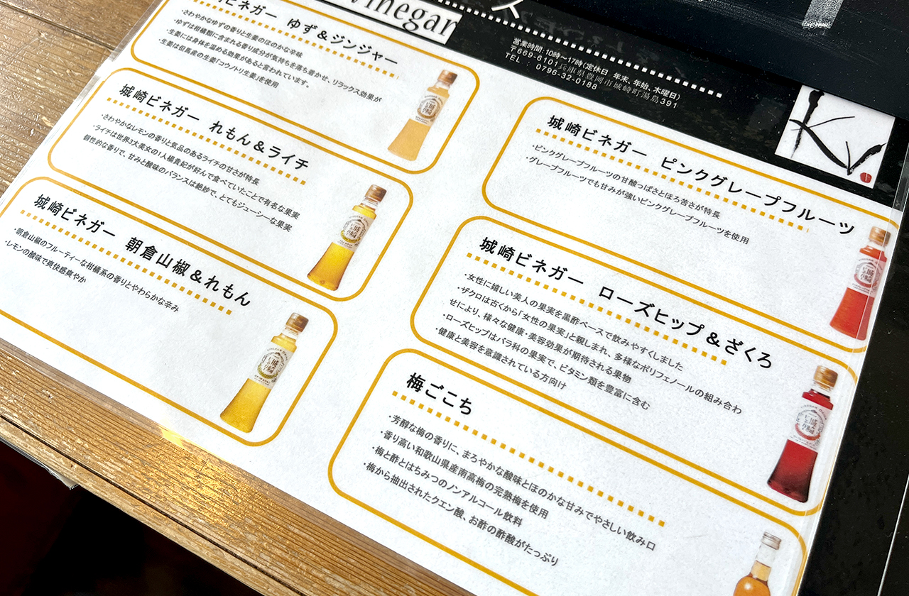 ※これらの「城崎ビネガー」はお店で少しずつ試飲させていただけるので、ぜひ試してみてください。