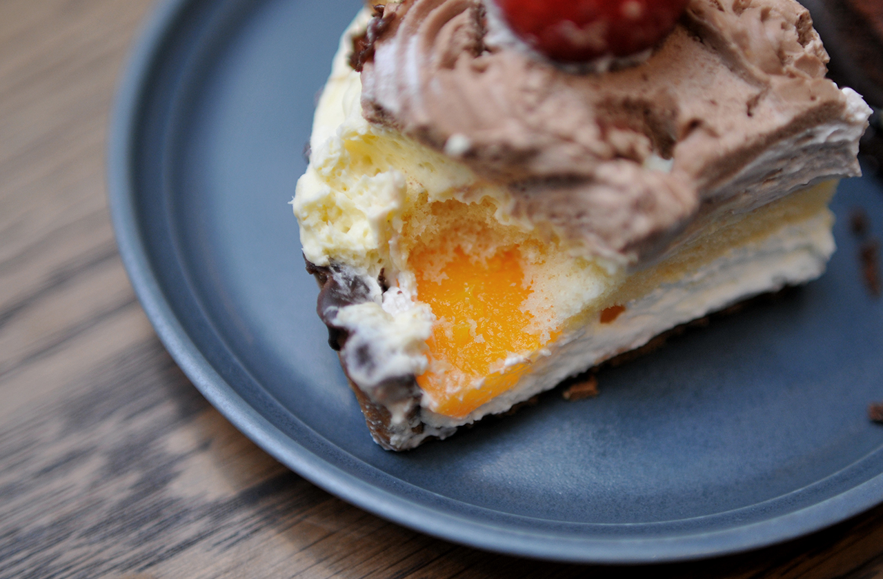 カスタードクリーム、スポンジケーキ、生クリームが丁寧に重ねられていて、なんと中には「桃のスライス」まで入っているサプライズ。
