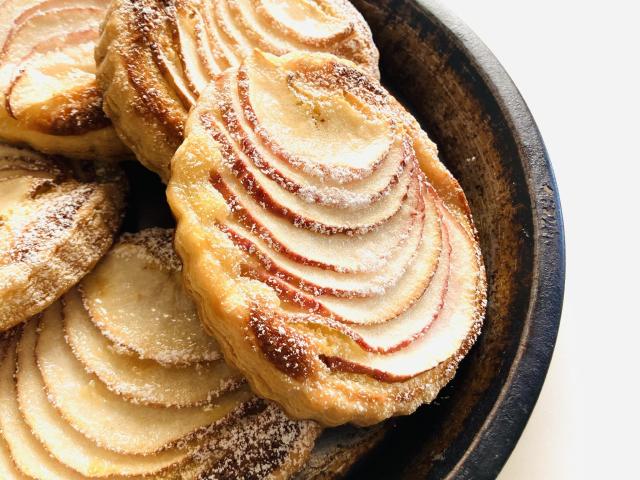 クレームダマンドと薄くスライスしたりんごを並べた薄焼きのアップルパイ
