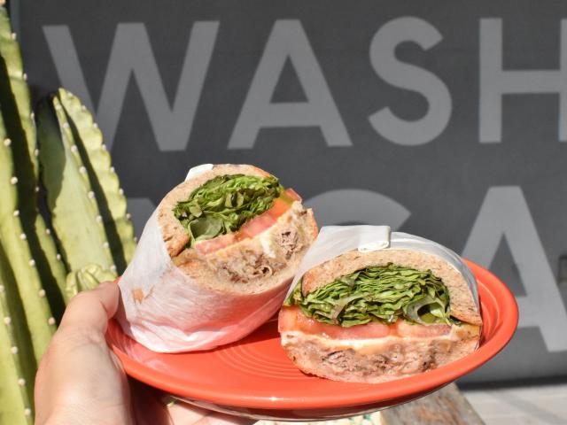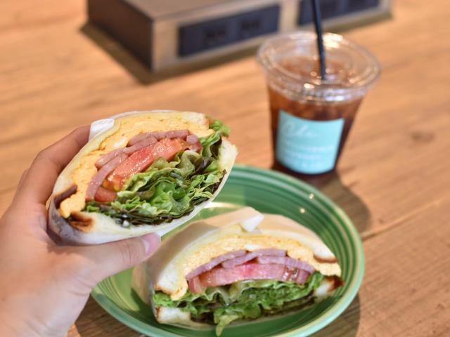 ベーコン、レタス、トマト、たまごを挟んだ ボリュームタップリの食べ応えのあるサンド