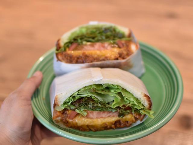 牛ひき肉に甘みのあるソースをたっぷり加えて チーズを挟んだサンドウィッチ。