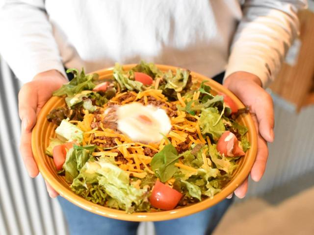 牛ミンチで甘辛く炒め、レッドチェダーチーズと ポーチドエッグをトッピングした人気メニュー。
