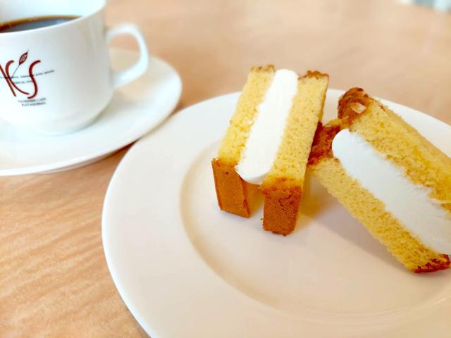 丹波産の新鮮な低温殺菌乳使用のミルクアイスを挽きたて米粉のカステラ“メシテラ”でサンドしました。