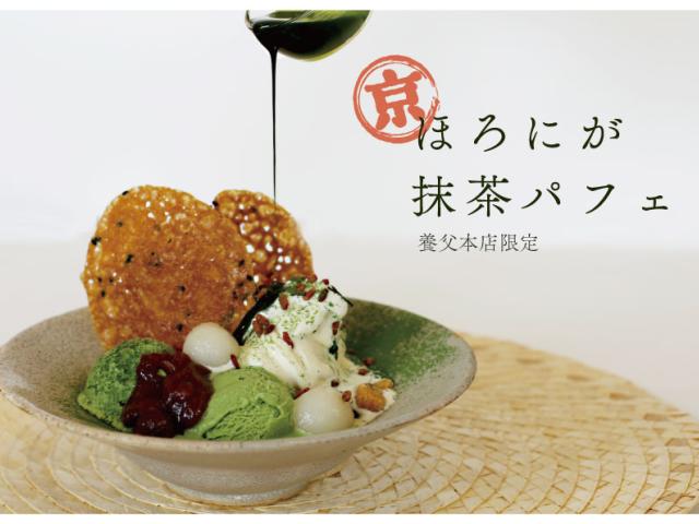 京都産の極上な抹茶と玄米茶を使用した風味豊かな抹茶パフェ。自家製の柚子わらび餅や餡、白玉などの和の食材が沢山詰まっていて、贅沢で上品な味わいです。お好みで抹茶ソースをかけ、味の変化をお愉しみください。 ※12時からの販売になります。