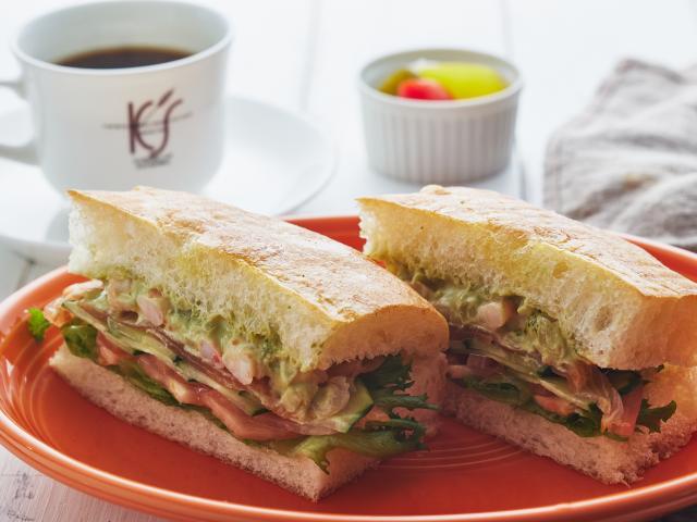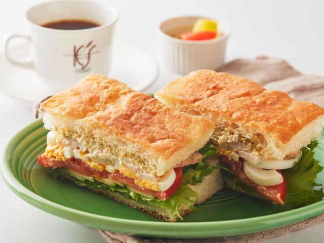 しっとりジューシーに仕上げたサラダチキンと新鮮野菜をたっぷり挟んだ夏限定のサンド。朝倉山椒のタプナードとタルタルソースの爽やかな風味が広がります。