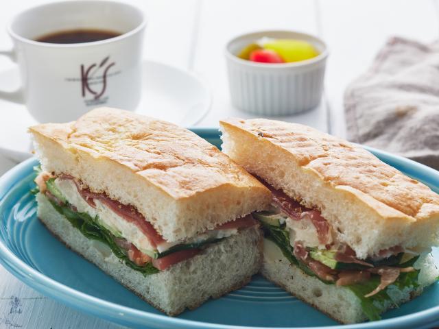 スペイン産の生ハム”ハモンセラーノ”と燻製チーズとジャガイモのサラダをサンドしたスモーキーな香りが特徴の新作サンド。