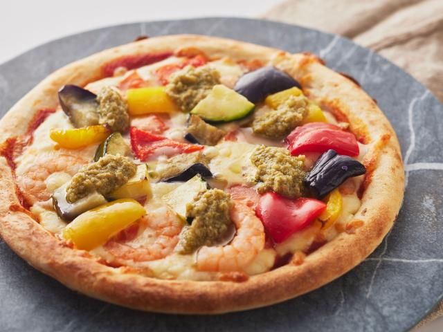 パプリカ、ズッキーニ、茄子、トマトと小海老を散りばめたピザに「朝倉山椒のタプナード」をトッピングした贅沢な味わいのピザ。