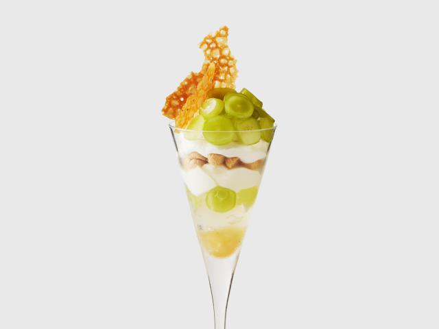 芳醇ですっきりとした甘さのシャインマスカットが主役のパフェ。上層はふんわり軽いヨーグルトエスプーマで爽やかな味わいに。最後にダージリンティーの心地良い渋みと、華やかに香るマスカットの余韻が感じられるパフェに仕上げました。
