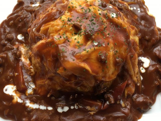 但馬牛を使った特製のデミハヤシソースがたっぷりかかった、ふわとろオムライスです。