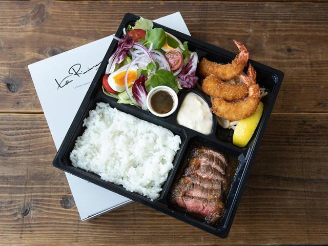 知る人ぞ知る!リビエールの人気裏メニュー。 但馬牛のステーキ、天然海老のエビフライ、サラダ、ごはんの入った人気のお弁当です。