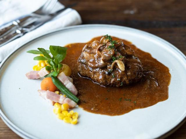 但馬牛と八鹿豚を贅沢に使った手ごねハンバーグをレストラン仕込みの デミグラスソースにたっぷりのキノコ、玉葱と一緒に煮込みました。 ジューシーな肉の旨味があふれる、フレンチシェフの煮込みハンバーグ。