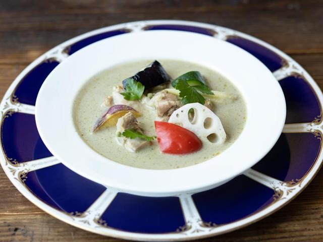 但馬鶏の旨味とココナッツミルクのまろやかさ、特産の朝倉山椒の爽やかな 風味をアクセントにしたスパイシーなタイ風グリーンカレー。 ご飯にもパンにも相性よく仕上げています。