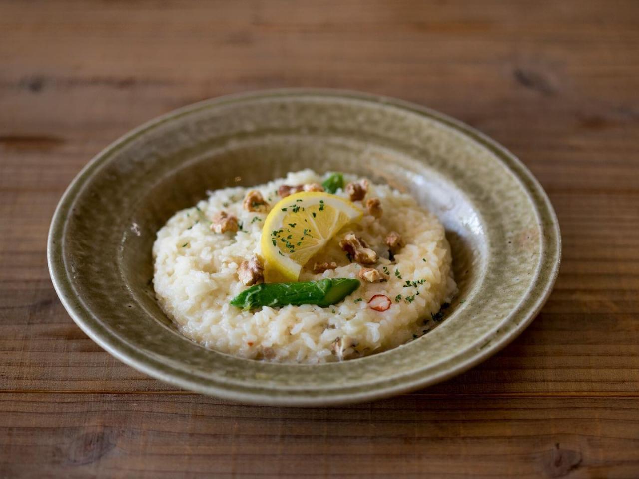おけしょう鮮魚で作られた、この地域の郷土料理へしこのミルクリゾットです。 アルコールのと相性は最高です。
