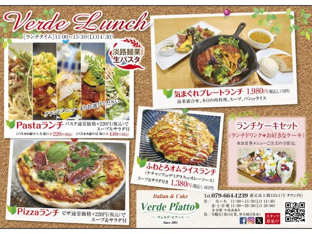日替りパスタを含む【パスタランチ(全種より)】(淡路麺業生パスタ使用)、【ピザランチ(全種より)】【ふわとろオムライスランチ(3種より)】【シェフの気まぐれプレートランチ】をご用意しております。 食後のデザートにおすすめ♪当店パティシエが作るケーキより1品(10種より)&ランチdrinkが付いた【ランチケーキセット】もおすすめです♪